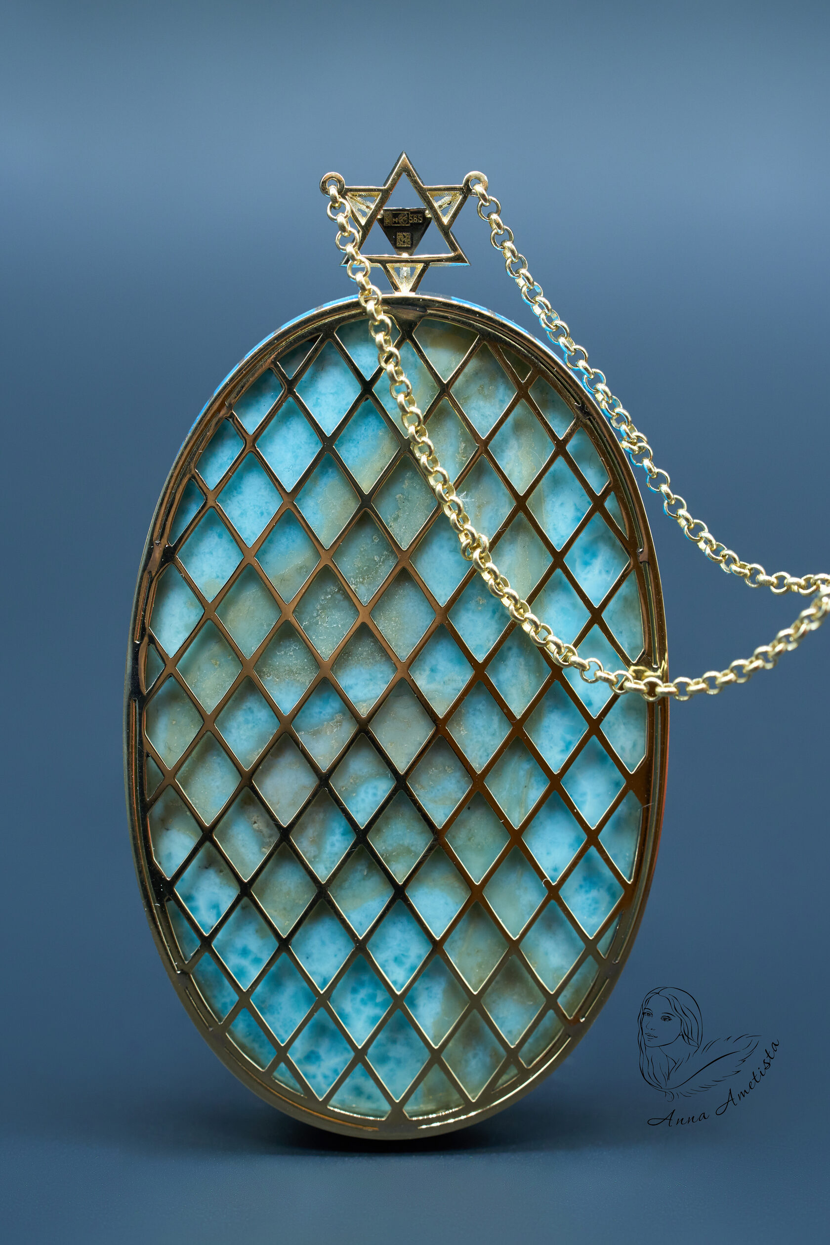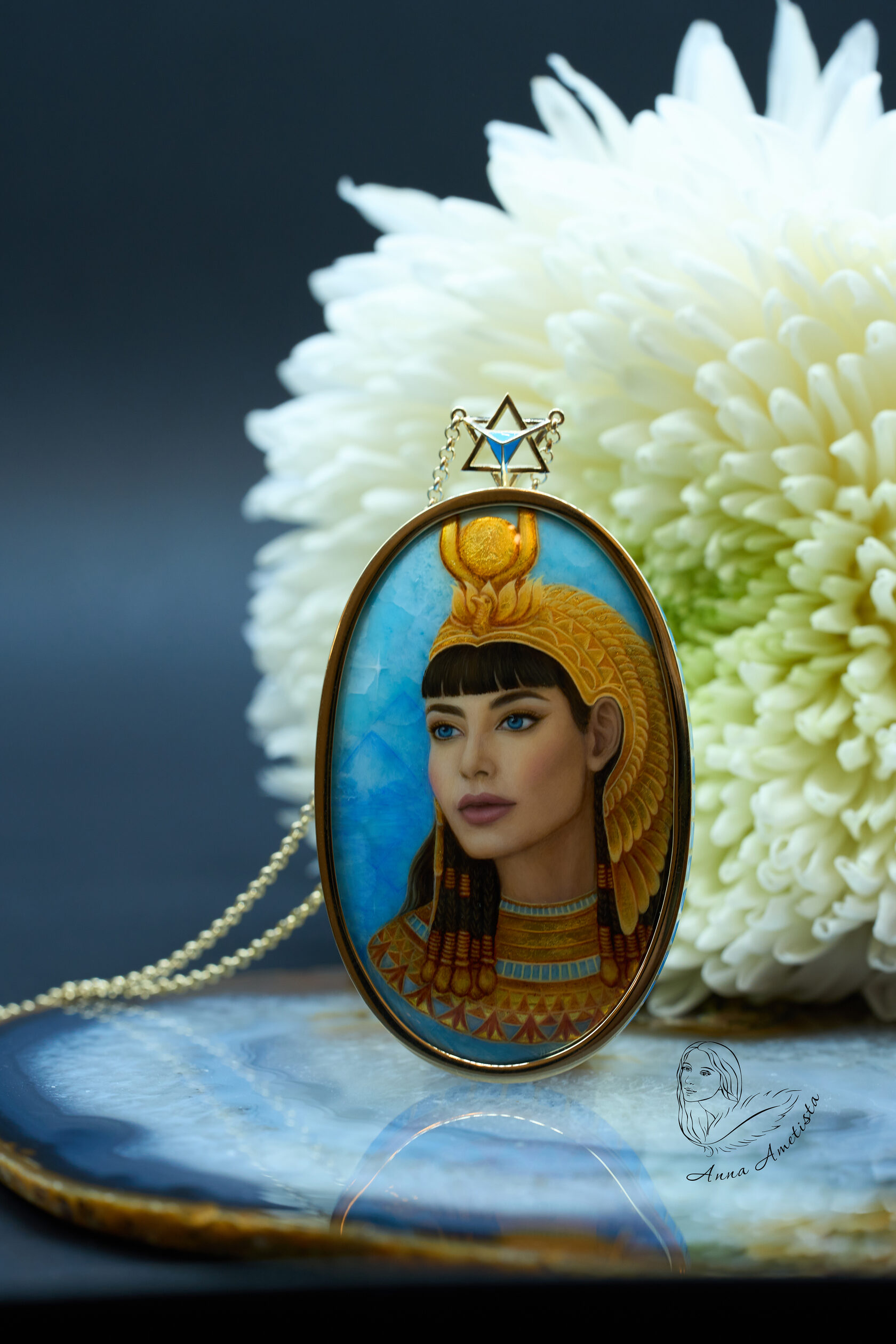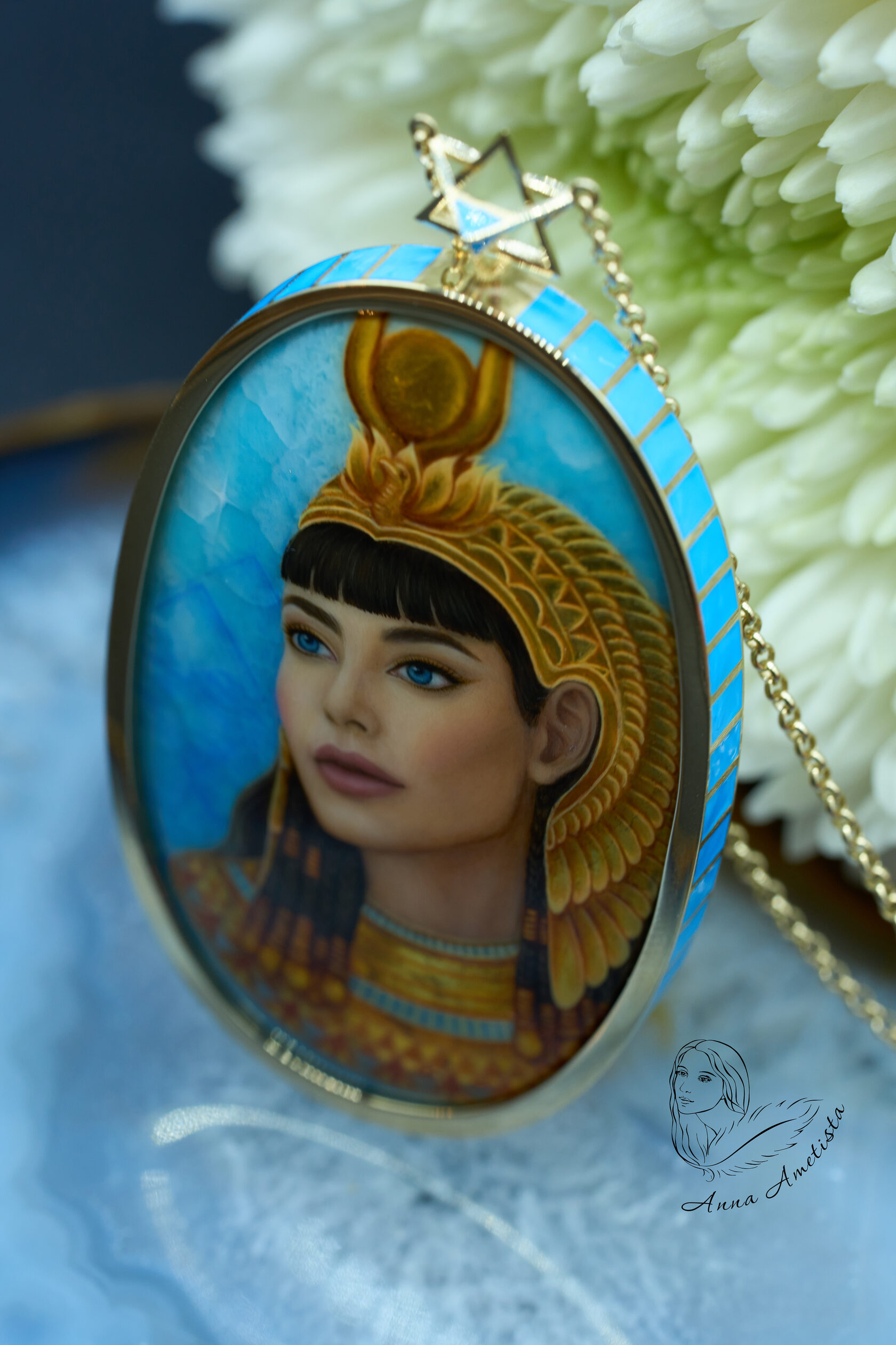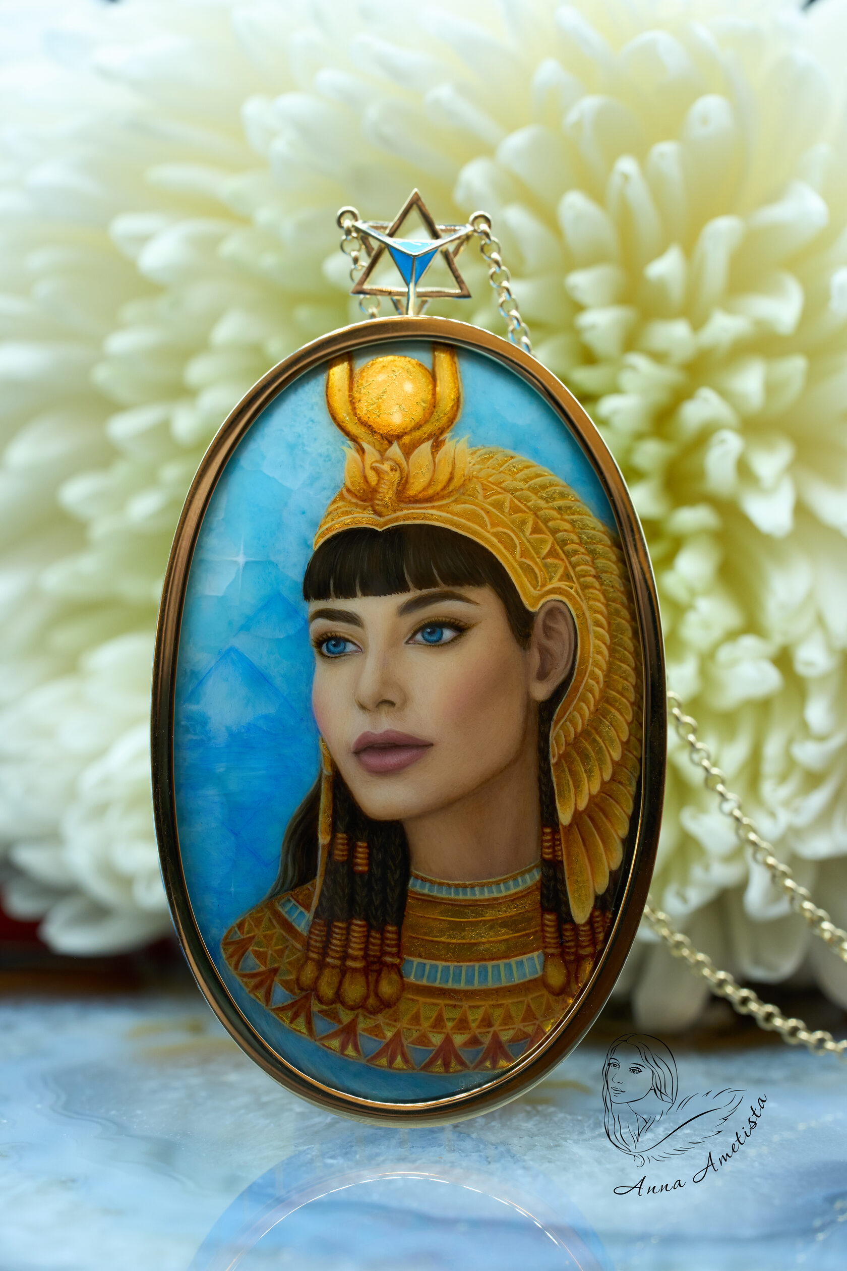 Кулон-талисман с ликом богини создан на основе портрета заказчицы. Это подарок для ее внучки, который будет напоминать о любимой бабушке и нести счастье. ⠀ В создании комплекта приняли участия трое замечательных мастеров: ⠀ Многослойная ювелирная живопись маслом на ларимаре, с использованием сусального золота - художник Анна Аметиста