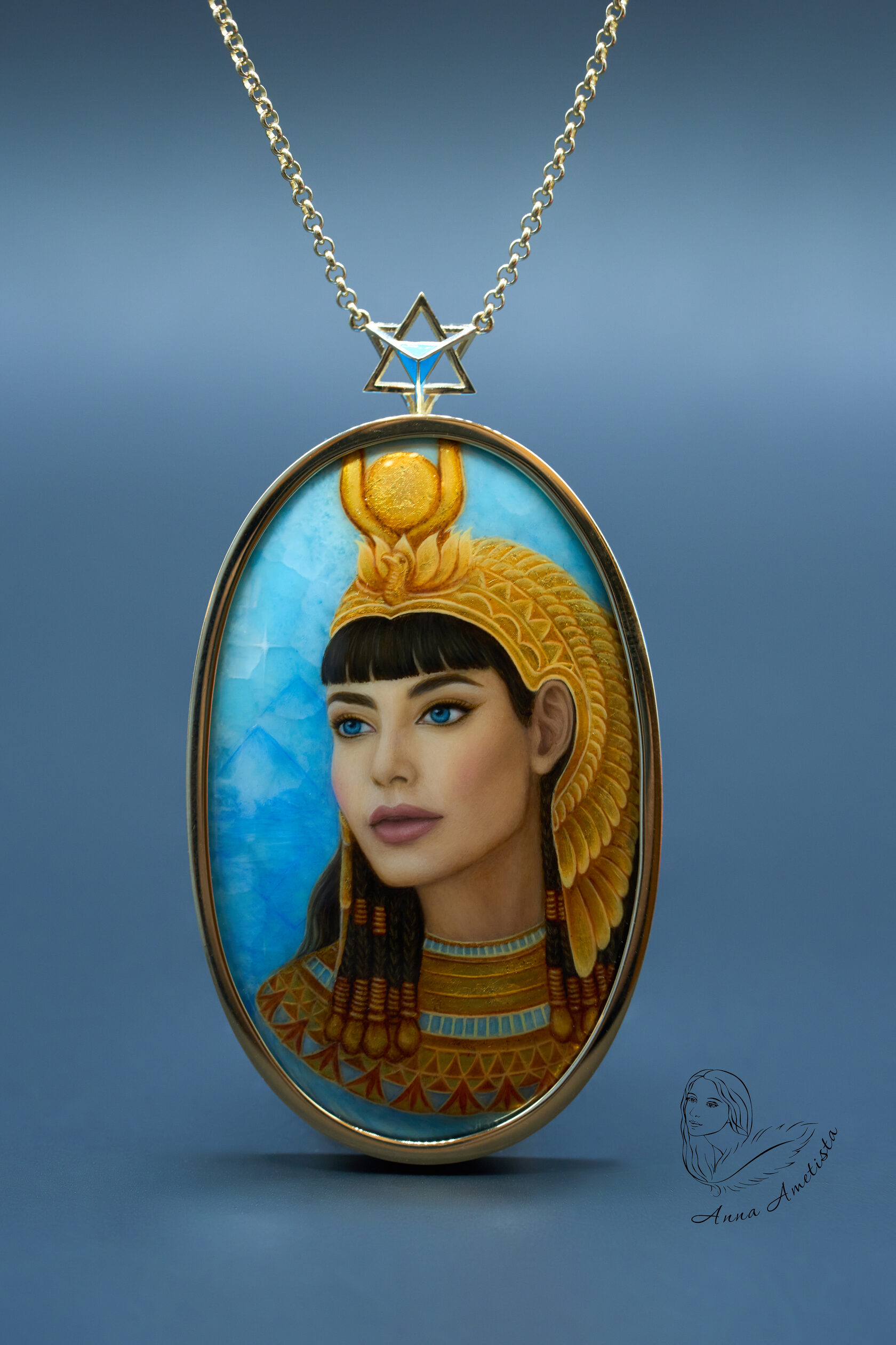 Кулон-талисман «Золотая Богиня Исида» на плагиоклазе. Многослойная роспись маслом в технике старинных мастеров. Декор сусальным золотом и натуральным сапфиром. Кулон прослужит более 200 лет при бережном обращении.